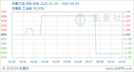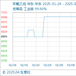 4月24日,生意社环氧乙烷基准价为6800.00元/吨,与本月初(7000.00元/吨)相比,下降了-2.86%。