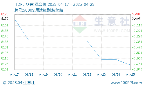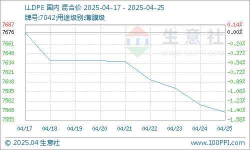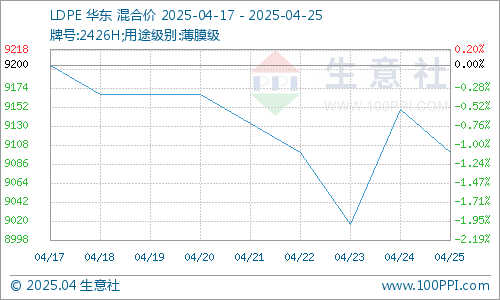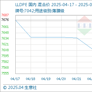据生意社商品行情分析系统监测,LLDPE(7042)4月17日均价7676元/吨,4月25日均价在7566元/吨,期间下跌1.43%。LDPE(2426H)4月17日均价9200元/吨,4月25日均价在9100元/吨,期间下跌1.09%。HDPE(2426H)4月17日均价8170元/吨,4月25日均价在8107元/吨,期间下跌0.76%。