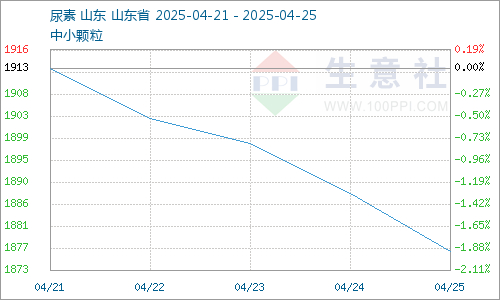 据生意社商品行情分析系统,截止4月25日,国内尿素市场参考均价为1876元/吨,较4月21日市场参考均价1913元/吨,国内尿素市场价格下跌幅度为1.92%。