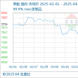 本周国内苯酚市场先扬后抑。据生意社监测的数据显示,4月18日国内苯酚市场价格6945元/吨,4月25日国内苯酚市场价格6975元/吨,涨幅0.43%。