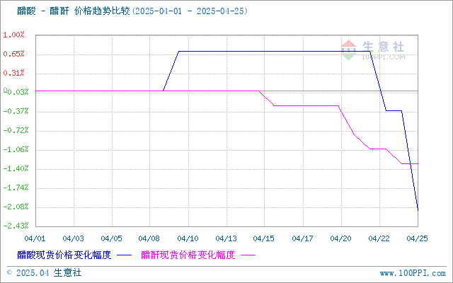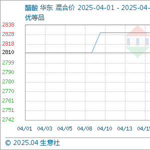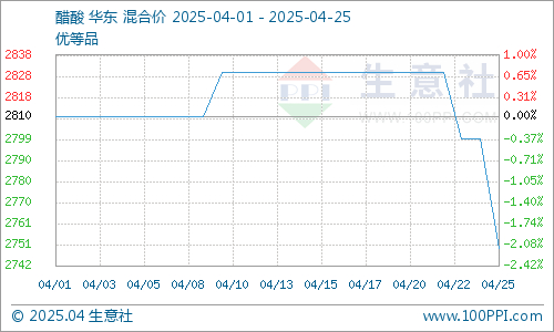 据生意社商品行情分析系统,截止4月25日醋酸均价在2750元/吨,较4月19日醋酸价格2830元/吨相比跌幅2.83%,较月初下调2.14%。