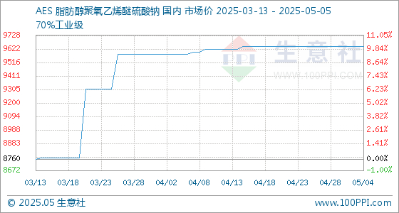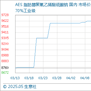 5月5日生意社AES 脂肪醇聚氧乙烯醚硫酸钠基准价为9640.00元/吨 生意社-大宗商品数据商 上海生意社信息服务有限公司官方账号 2025.05.0508:30 关注 生意社05月05日讯 5月5日,生意社AES 脂肪醇聚氧乙烯醚硫酸钠基准价为9640.00元/吨,与本月初持平。 (文章来源:生意社)