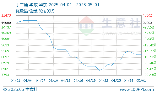 国内丁二烯市场4月份先跌后涨。上旬清明节附近部分下游补仓,但随着部分竞拍货源溢价成交以及原油、关税以及港口到港消息影响下,市场中旬丁二烯价格显著下行。月底下游部分企业逢低采购,市场交投气氛略有好转,行情止跌回升。