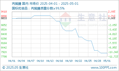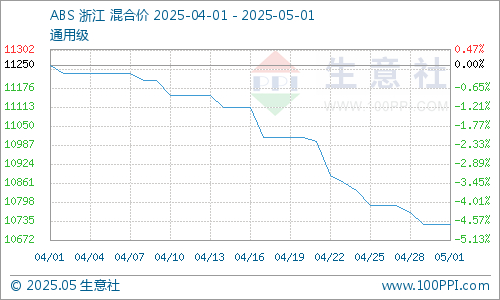 4月整月,国内ABS市场行情持续走跌,大部分牌号现货价格震荡下调。据生意社商品行情分析系统显示,截止5月1日,ABS样本产品均价在10725元/吨,价格水平较4月初涨跌幅-4.67%。