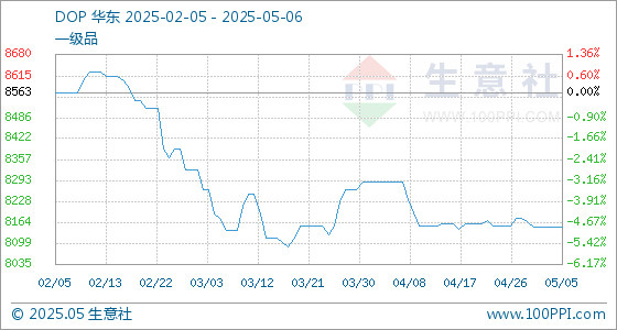 5月6日,生意社DOP基准价为8147.50元/吨,与本月初持平。