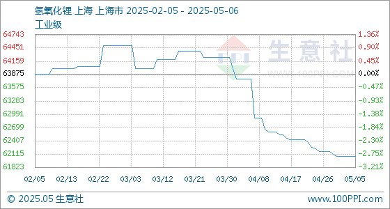 5月6日生意社氢氧化锂(工业级)基准价为62066.67元/吨