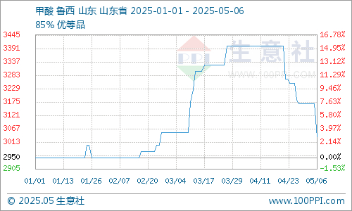 据生意社商品行情分析系统显示:近期甲酸价格出现回调,截至5月6日,国内85%工业级甲酸均价3033元/吨,较节前4月末3166元/吨,下降4.21%,较去年同期3287元/吨下跌7.73%。
