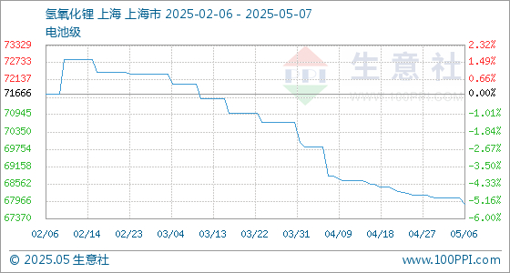 5月7日,生意社氢氧化锂(电池级)基准价为67866.67元/吨,与本月初(68066.67元/吨)相比,下降了-0.29%。