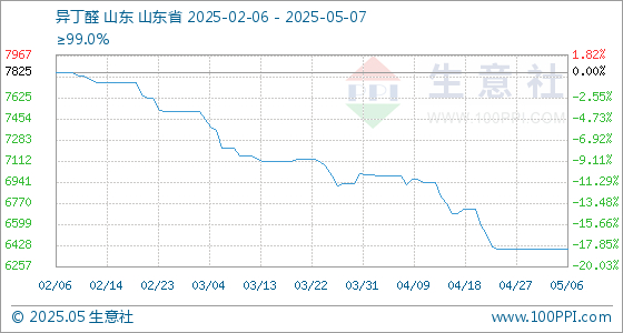 5月7日,生意社异丁醛基准价为6400.00元/吨,与本月初持平。