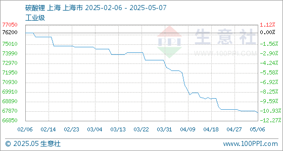 5月7日生意社碳酸锂(工业级)基准价为67700.00元/吨