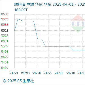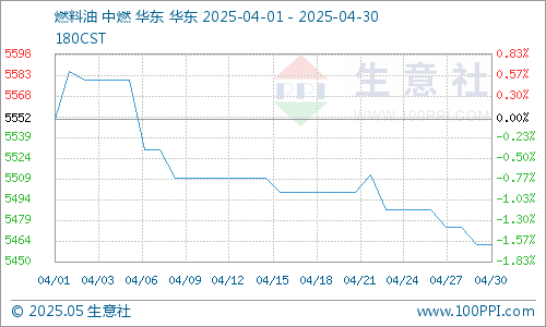 据生意社商品分析系统显示,4月份国内华东地区船燃市场行情整体下跌。截至4月30日国内燃料油180CST均价为5462.50元/吨,较4月1日的5552.00元/吨,下跌1.61%。