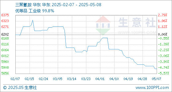 5月8日,生意社三聚氰胺基准价为5900.00元/吨,与本月初(5925.00元/吨)相比,下降了-0.42%。