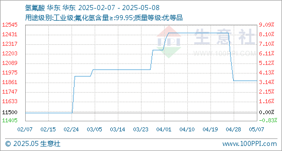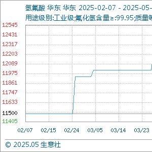 5月8日,生意社氢氟酸基准价为11883.33元/吨,与本月初持平。