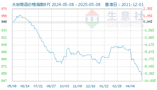 5月8日大宗商品价格指数BPI为857点,与昨日持平,较周期内最高点1343点(2021-10-19)下降了36.19%,较2016年02月03日最低点660点上涨了29.85%。