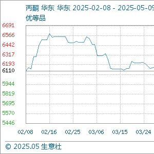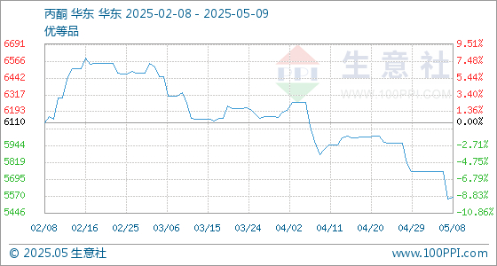 5月9日,生意社丙酮基准价为5563.33元/吨,与本月初(5750.00元/吨)相比,下降了-3.25%。