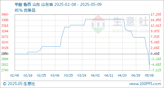 5月9日,生意社甲酸基准价为2800.00元/吨,与本月初(3166.67元/吨)相比,下降了-11.58%。