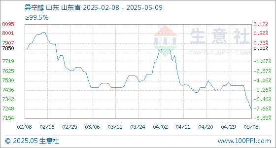 5月9日,生意社异辛醇基准价为7233.33元/吨,与本月初(7483.33元/吨)相比,下降了-3.34%。