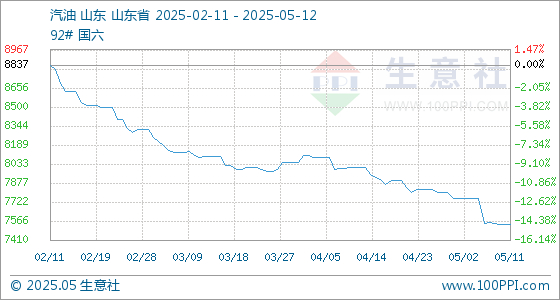5月12日,生意社汽油基准价为7540.50元/吨,与本月初(7752.50元/吨)相比,下降了-2.73%。