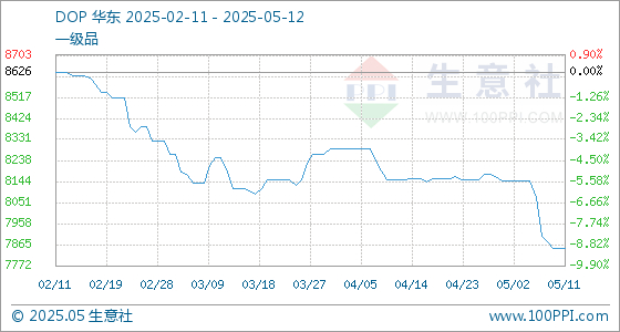 5月12日,生意社DOP基准价为7850.00元/吨,与本月初(8147.50元/吨)相比,下降了-3.65%。