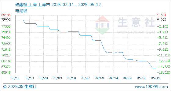 5月12日生意社碳酸锂(电池级)基准价为67133.33元/吨