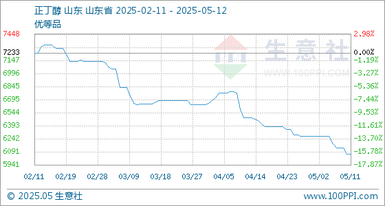 5月12日生意社正丁醇(工业级)基准价为6066.67元/吨