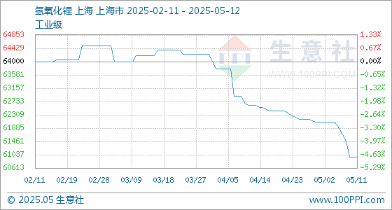 5月12日,生意社氢氧化锂(工业级)基准价为60966.67元/吨,与本月初(62066.67元/吨)相比,下降了-1.77%。