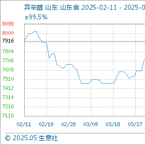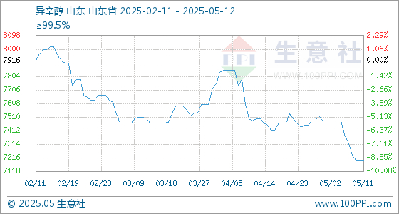 5月12日,生意社异辛醇基准价为7200.00元/吨,与本月初(7483.33元/吨)相比,下降了-3.79%。