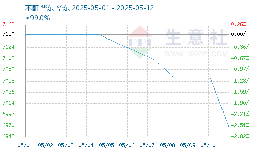 据生意社商品行情分析系统,截止5月12日邻法苯酐报价为7150元/吨,较4月1日苯酐价格7433.33元/吨震荡下跌,跌幅3.81%。4月苯酐企业设备开工缓慢恢复,苯酐供给增加;下游增塑剂需求疲软,苯酐价格震荡下跌。