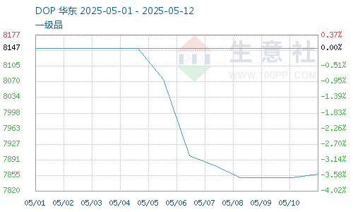据生意社商品行情分析系统,截止5月12日,DOP价格8166.66元/吨,较4月1日DOP价格8288.75元/吨震荡下跌,跌幅1.47%。增塑剂DOP企业开工率降至5成左右,增塑剂DOP产量下降,苯酐下游需求疲软,苯酐价格下跌压力加大。