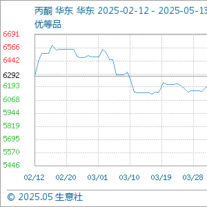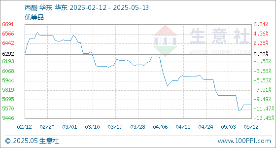 5月13日,生意社丙酮基准价为5623.33元/吨,与本月初(5750.00元/吨)相比,下降了-2.20%。
