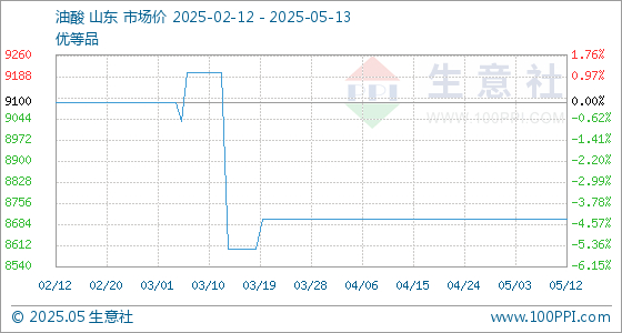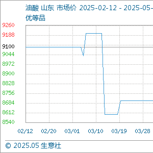 5月13日,生意社油酸基准价为8700.00元/吨,与本月初持平。