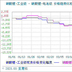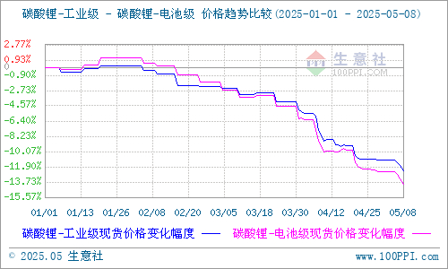 据生意社商品行情分析系统显示:碳酸锂近期价格一跌再跌,截至5月13日,国内电池级碳酸锂基准价65633元/吨,较月初68933元/吨下跌4.79%,较年初78800元/吨下跌16.71%,较去年同期下跌43.52%;国内工业级碳酸锂基准价64900元/吨,较月初67900元/吨下跌4.42%,较年初76400元/吨下跌15%,较去年同期下跌40.57%。