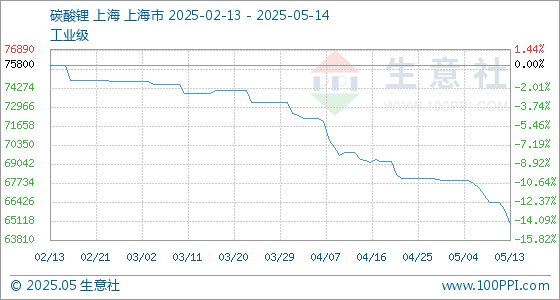 5月14日生意社碳酸锂(工业级)基准价为64900.00元/吨
