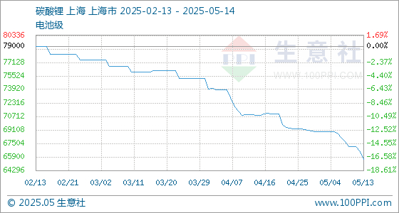 5月14日生意社碳酸锂(电池级)基准价为65633.33元/吨