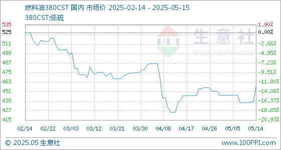 5月15日生意社燃料油380CST基准价为459.00美元/吨