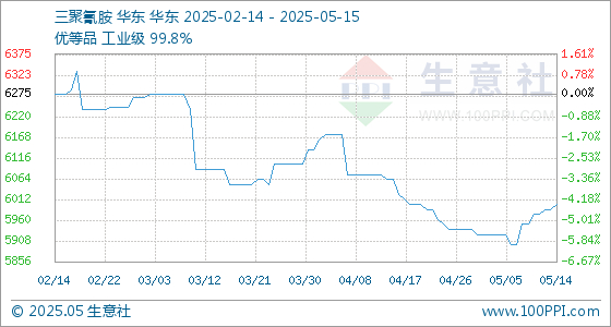 5月15日,生意社三聚氰胺基准价为6000.00元/吨,与本月初(5925.00元/吨)相比,上涨了1.27%。