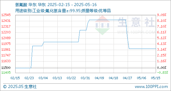 5月16日,生意社氢氟酸基准价为11883.33元/吨,与本月初持平。