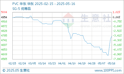 据生意社商品行情分析系统监测显示,本周(5.12-16)PVC现货市场逆转颓势,价格明显反弹。截止周五,国内PVC电石法SG-5型均价4782元/吨,周内上涨3.87%。