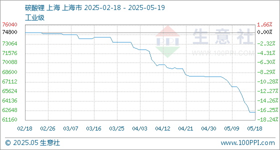 5月19日生意社碳酸锂(工业级)基准价为62400.00元/吨