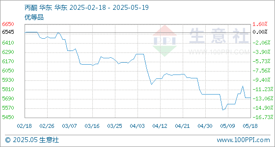 5月19日,生意社丙酮基准价为5706.67元/吨,与本月初(5750.00元/吨)相比,下降了-0.75%。
