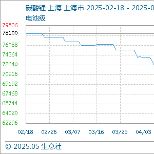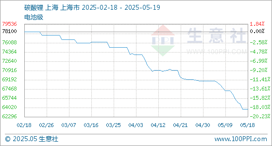 5月19日生意社碳酸锂(电池级)基准价为63733.33元/吨