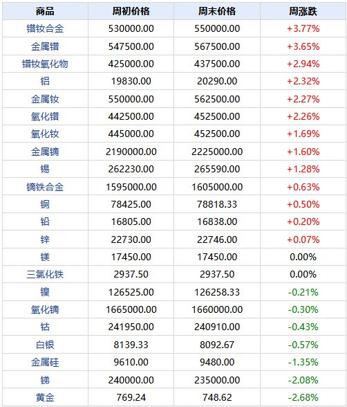 据生意社价格监测,2025年第19周(5.12-5.16)大宗商品价格涨跌榜中有色板块环比上升的商品共13种,涨幅前3的商品分别为镨钕合金(3.77%)、金属镨(3.65%)、镨钕氧化物(2.94%)。环比下降的商品共有7种,跌幅前3的产品分别为黄金(-2.68%)、锑(-2.08%)、金属硅(-1.35%)。