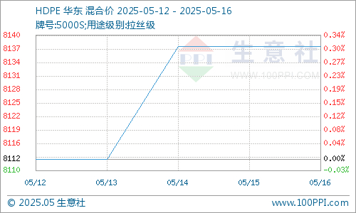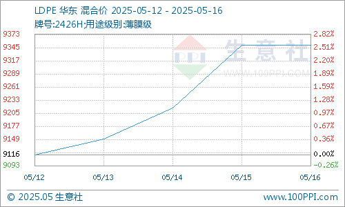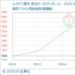 据生意社商品行情分析系统监测,LLDPE(7042)5月12日均价7428元/吨,5月16日均价在7566元/吨,期间上涨1.86%。LDPE(2426H)5月12日均价9116元/吨,5月16日均价在9350元/吨,期间上涨2.56%。HDPE(2426H)5月12日均价8112元/吨,5月16日均价在8137元/吨,期间上涨0.31%。