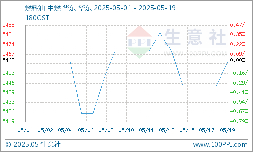 据生意社商品分析系统显示,本周华东地区燃料油180CST行情震荡整理,整体小幅下行,截止5月19日国内燃料油180CST均价为5462.50元/吨(均含税),较5月12日的5470.00元/吨价格下跌0.14%。