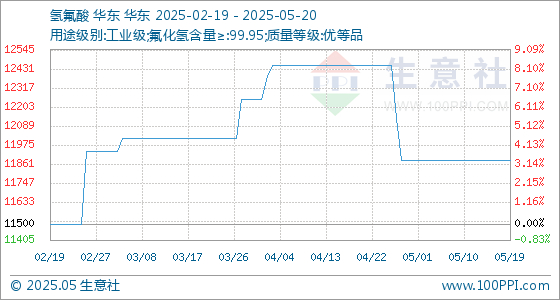 5月20日,生意社氢氟酸基准价为11883.33元/吨,与本月初持平。