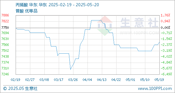 5月20日,生意社丙烯酸基准价为7600.00元/吨,与本月初(7533.33元/吨)相比,上涨了0.89%。