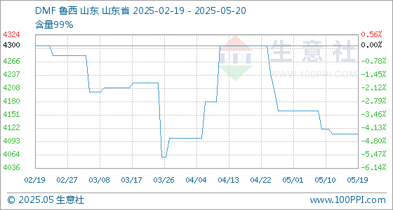 5月20日,生意社DMF基准价为4110.00元/吨,与本月初(4160.00元/吨)相比,下降了-1.20%。