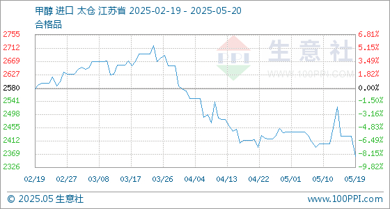 5月20日,生意社甲醇基准价为2362.50元/吨,与本月初(2440.00元/吨)相比,下降了-3.18%。