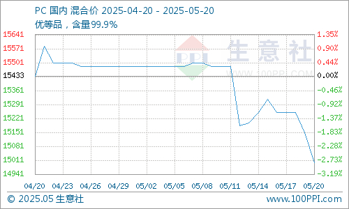 据生意社大宗榜数据显示,五月中旬国内PC市场行情震荡有跌,部分牌号现货价格涨跌互现。截止5月20日,生意社PC混合基准价在15000元/吨左右,价格相较于5月初涨跌幅-3.12%。