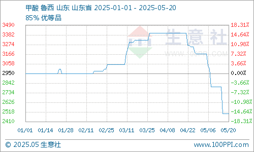 据生意社商品行情分析系统显示:近期国内85%甲酸大幅跳水,截至5月20日,生意社甲酸基准价2500元/吨,5日内下跌10.71%,30日内下跌26.47%。